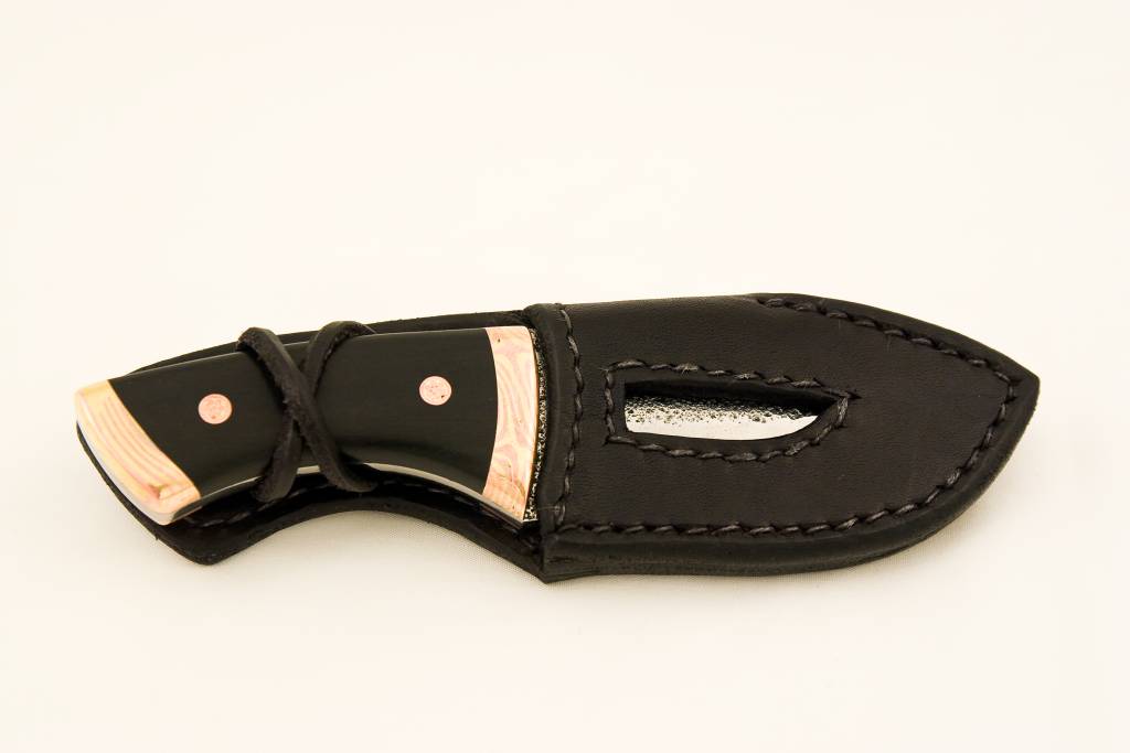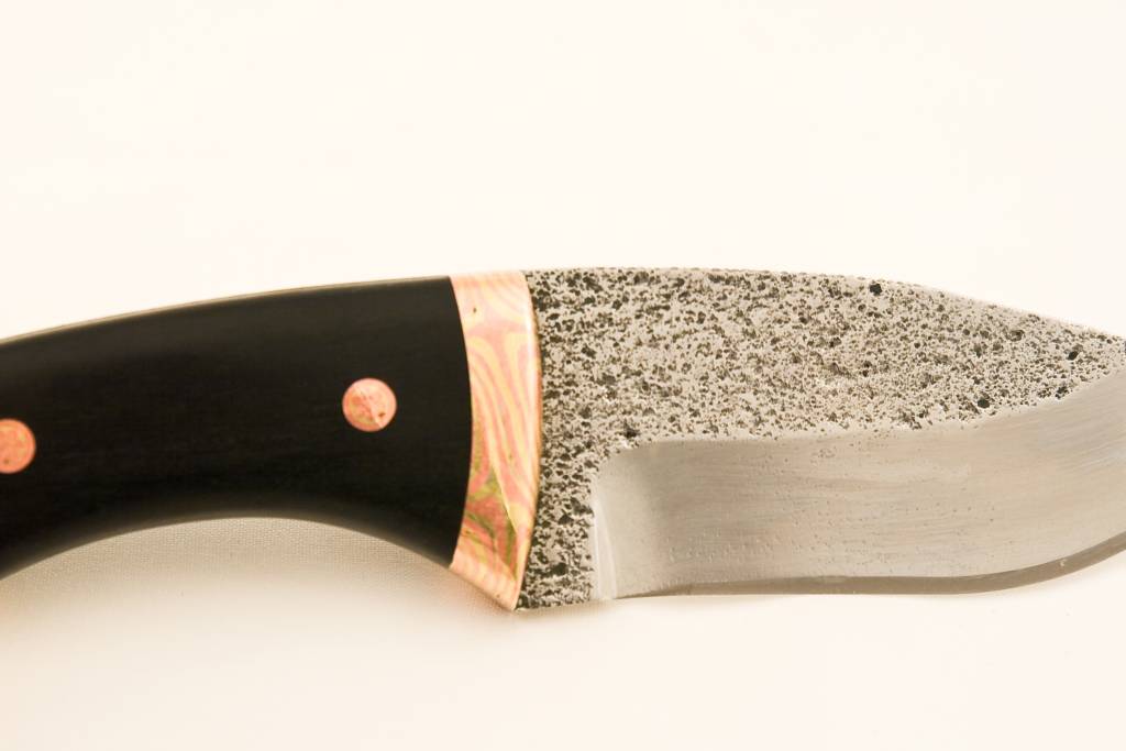 Stahovací nůž z nerezové oceli „ELMAX“ Stahovací nůž z nerezové oceli „ELMAX“. Záštity a hlavice vyrobeny z „MOKUME“ (měď prokovaná s mosazí). Střenky z ebenu, ozdobné nýty ve tvaru květu z mědi a mosazi.