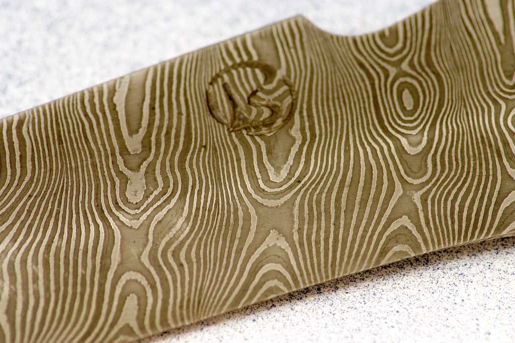 Otevřený nůž z tordované damascenské oceli Otevřený nůž s čepelí a trnem z tordované damascenské oceli Otevřený nůž s čepelí a trnem z tordované damascenské oceli. Záštita , hlavice a nýty z nerezu. Střenky z hovězí kosti. Technické údaje:Délka čepele: 120 mmCelková délka: 110 mm
