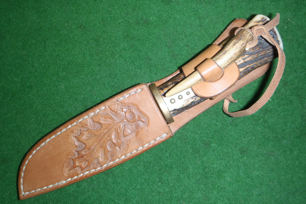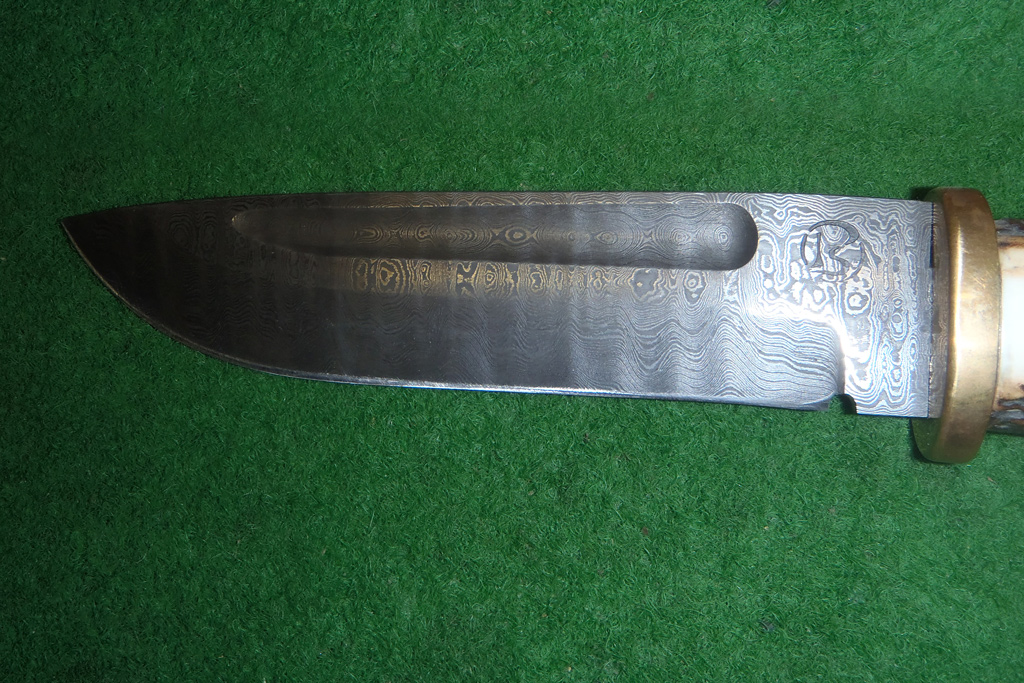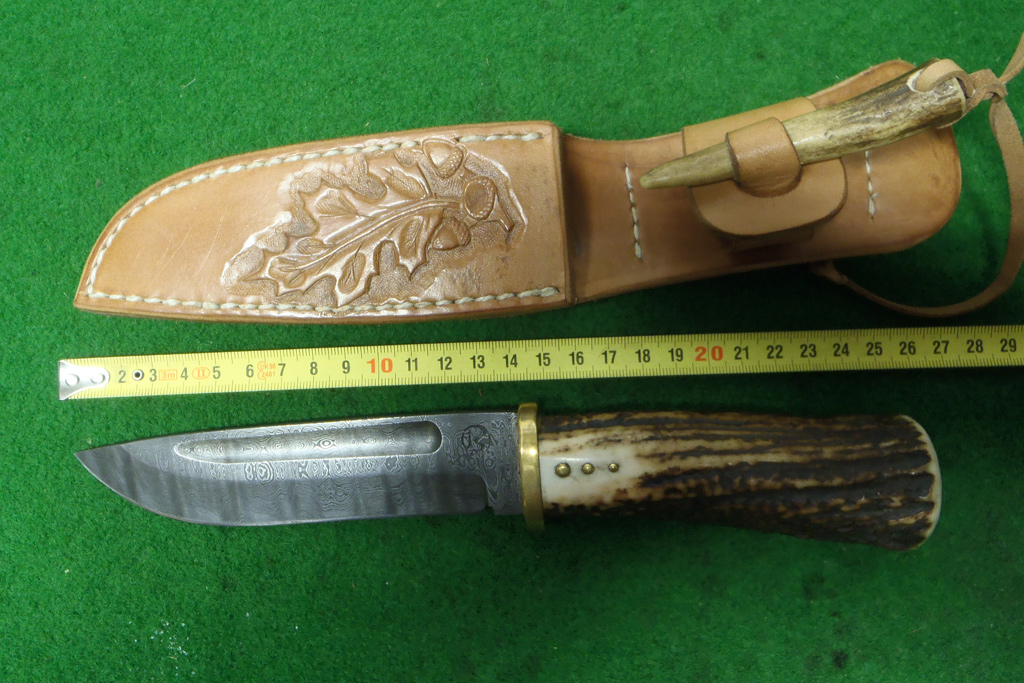 Damascénský nůž s pouzdrem Damascénský nůž s pouzdrem. Technické údaje:- Délka čepele: 14cm- Celková délka: 25cm- Provedení: rukojeť jelení paroh, mosazná záštita- Tvrdost: 58 HRc- Příslušenství: kožené pouzdro- Cena s pouzdrem: 5.600,- Kč